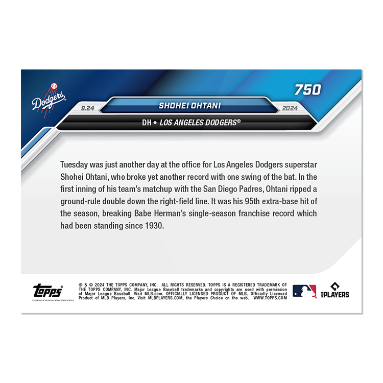 Shohei Ohtani - 2024 MLB TOPPS NOW® Card 750 Blue 10/49 大谷翔平 球団新記録シーズン 95長打 世界で49枚の中の1枚